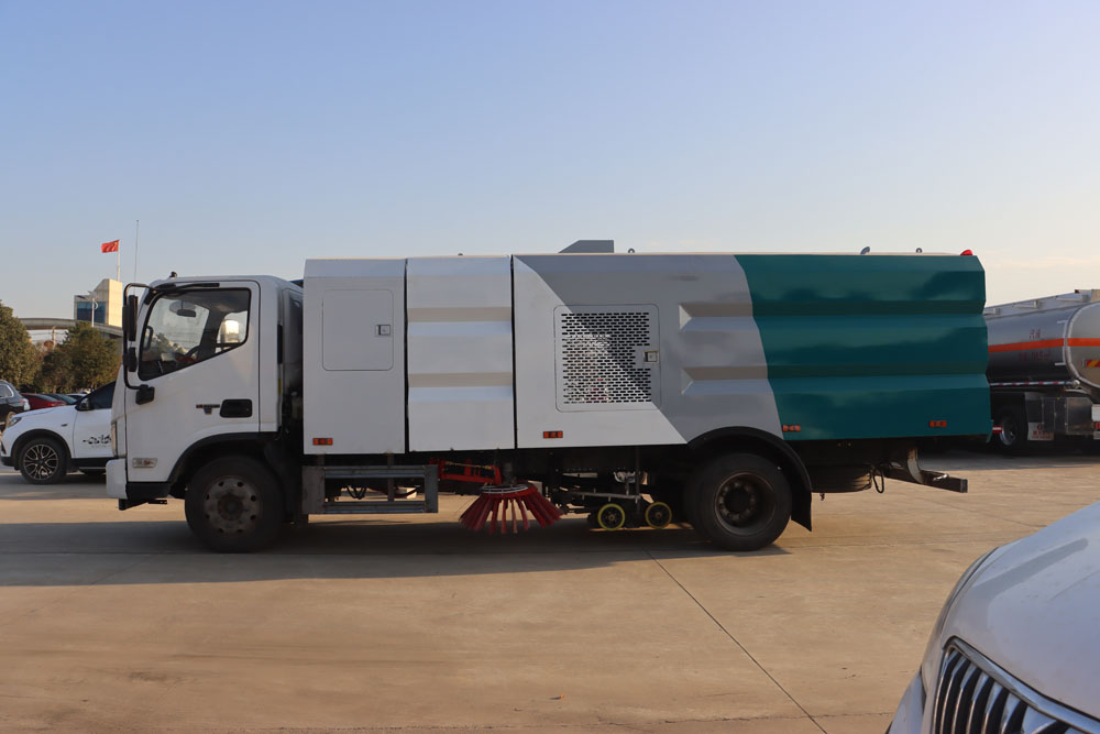 ● 中置兩盤掃(掃盤可單獨控制)+中置寬吸嘴+內置高壓主噴桿+左右高壓側噴桿(左右高壓側噴管可獨立控制)結構,實現路面的洗掃及吸塵。