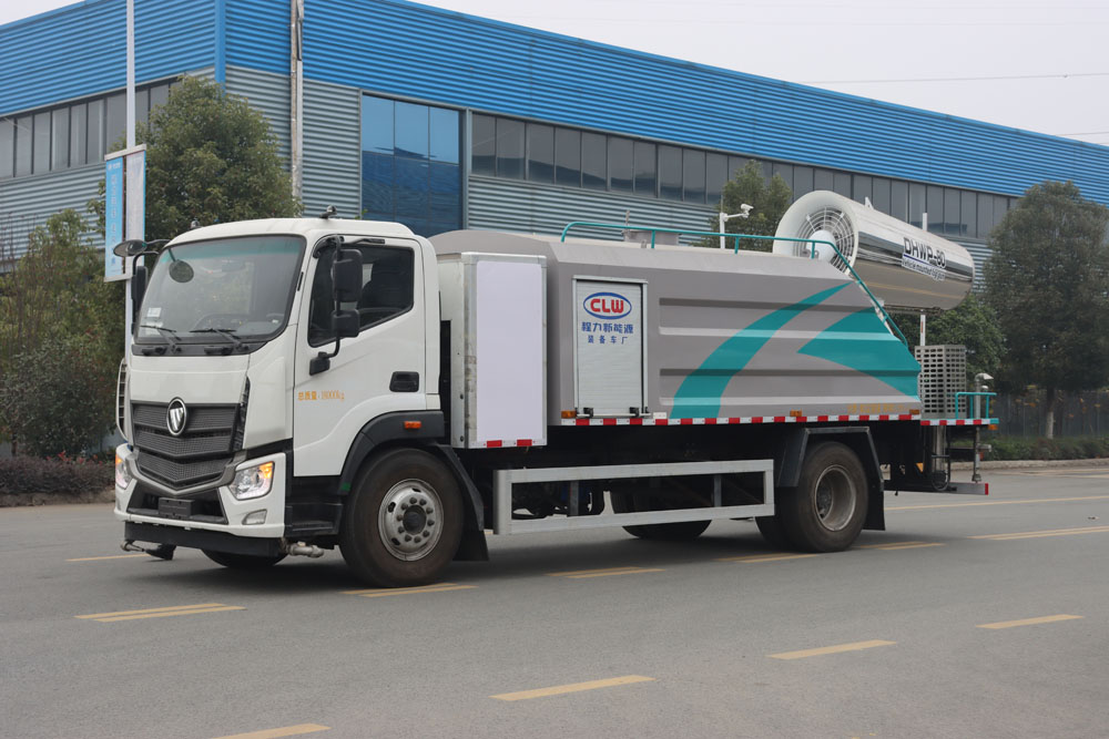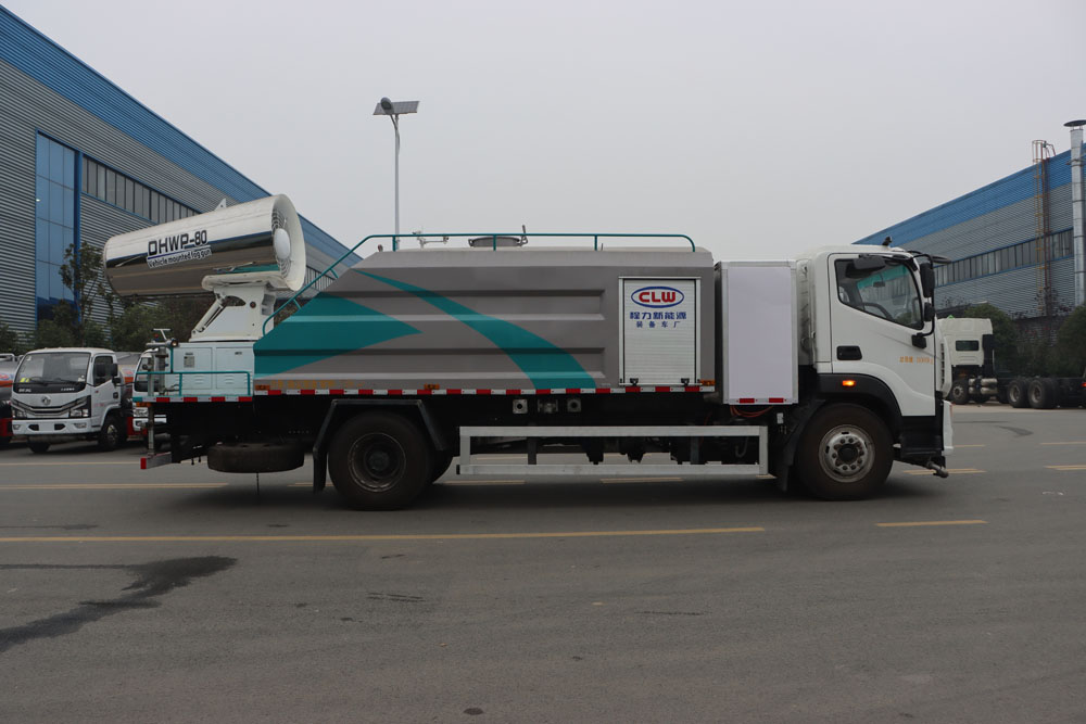 四、其他說明: 福田純電動多功能抑塵車是在純電動二類底盤的基礎(chǔ)上,加裝低壓沖洗、灑水系統(tǒng)、霧炮機(jī)組,由機(jī)械、液壓(氣路)、電器三部分合為一體的專用灑水作業(yè)車。 采用自吸式雙級離心泵,效率高、灑水寬度大、水槍射程遠(yuǎn),低壓水泵由底盤變速器取力器通過傳動軸直接傳動。霧炮機(jī)組由底盤電池帶動霧炮風(fēng)扇電機(jī)、不銹鋼多級離心泵,進(jìn)行噴霧降塵工作。