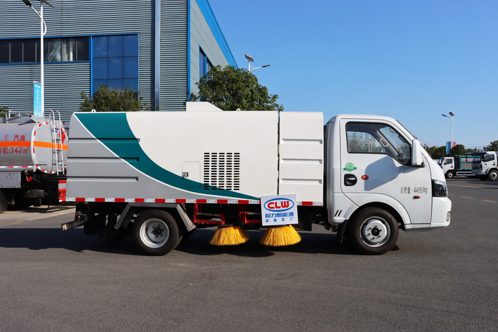 3、掃路車采用東風純電動二類汽車底盤改裝,加裝風機、清水箱、垃圾箱、左右立掃、帶噴水桿的寬吸嘴、掃盤降塵系統、液壓系統、專用裝置電控系統和副車架等改裝而成。