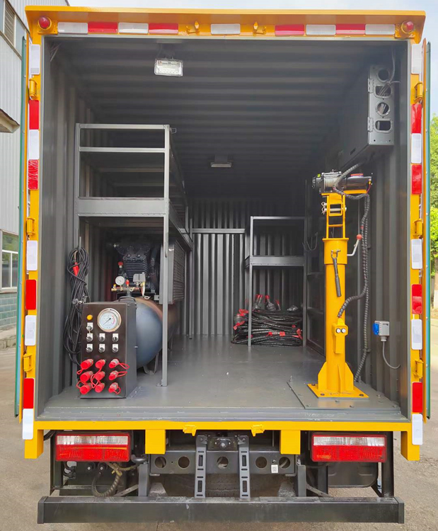 四、其他說明: 東風(fēng)多利卡雙排座底盤,國六全柴115馬力,5檔變速箱,雙排座駕駛室 側(cè)面和后面各一個(gè)雙開門,箱內(nèi)設(shè)計(jì)兩個(gè)貨架,箱內(nèi)設(shè)計(jì)照明燈 安裝液壓動(dòng)力系統(tǒng),三套液壓動(dòng)力取力快速接口,帶控制面板 兩臺(tái)4寸的渣漿泵,帶水帶和液壓管(帶快接) 裝一個(gè)液壓驅(qū)動(dòng)空壓機(jī),一個(gè)800公斤12V電控小吊機(jī) 安裝3500W逆變器,帶電控箱,其他標(biāo)配